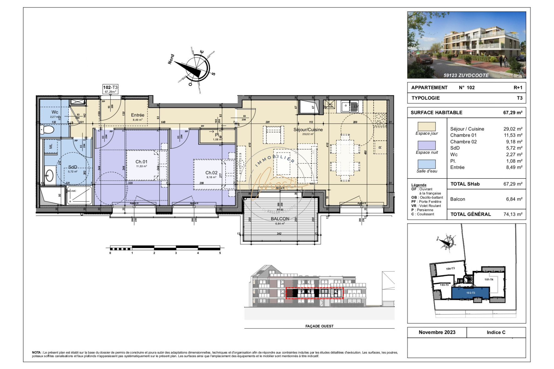 Cet appartement de 67,29m², situé au 1er étage de cette résidence sécurisée, se compose d'une entrée avec placard de rangement, d'un séjour ouvert sur la cuisine et offrant un accès à un balcon de 6,84m² orienté Ouest, de deux chambres , d'une salle d'eau et d'un wc indépendant.